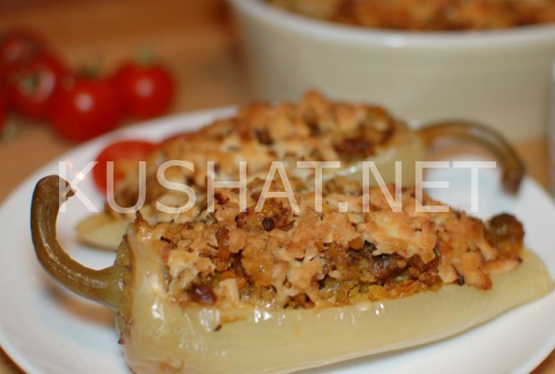 Поставьте их в разогретую до 180 градусов духовку и выпекайте около 30 минут. За 5 минут до окончания запекания посыпьте фаршированный перец остальным сыром осцыпек.
