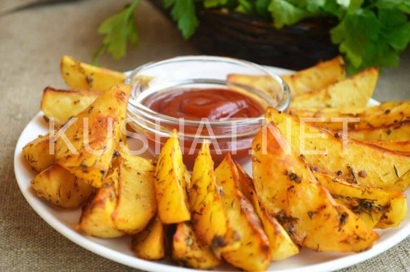 Готовый картофель снимают с противня лопаткой и подают в качестве основного гарнира или закуски. Как и к другим подобного рода блюдам к нему хорошо подойдет кетчуп, соус «Тартар», сметано-чесночный соус, сырный, горчица и прочие. Вкусен он будет и с американским сырным соусом и с соусом барбекю. Приятного вам аппетита. Рекомендую приготовить также и картофель, фаршированный салом в духовке.