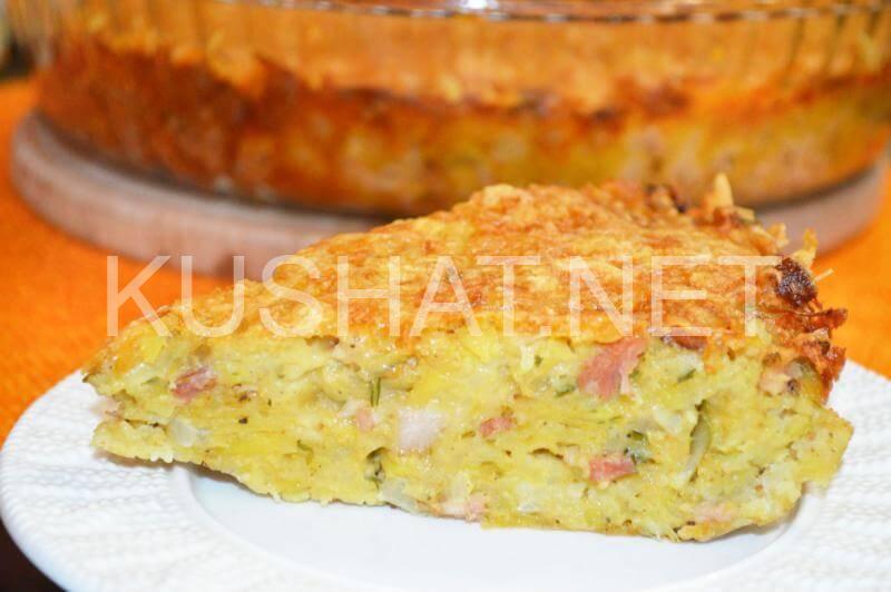 По вкусу она очень напоминает картофельные драники ли деруны. В том случае, если хочется вкусных зажаристых дерунов, а времени на их приготовлении нет, то этот рецепт придет вам на помощь. Все что нужно, это приготовить картофельную массу для запеканки и поставить ее в духовку. Если нет под рукой ветчины, то ее всегда можно заменить копченой колбасой, беконом или пережаренным подчеревком – будет тоже вкусно. Данный рецепт картофельной запеканки с ветчиной и сыром рассчитан на форму 25 см.