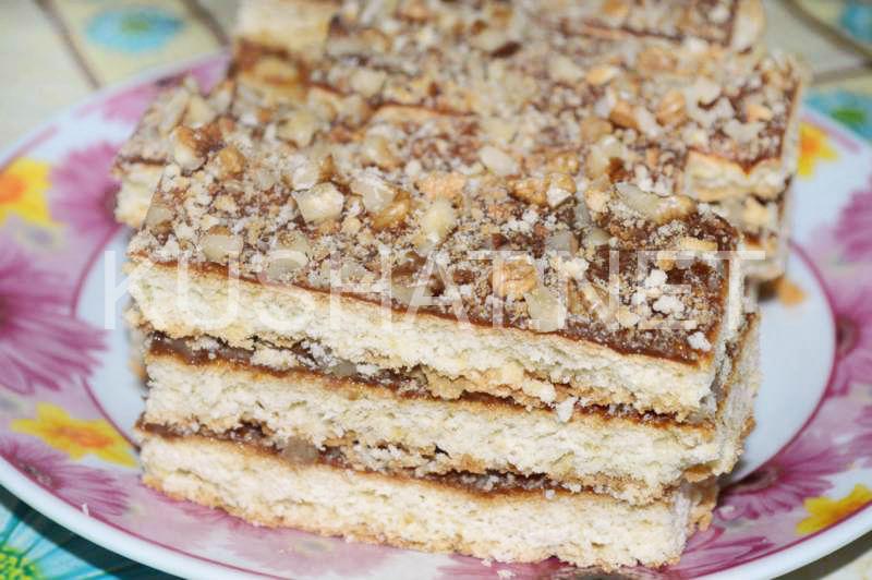 Теперь можно приступить к следующему этапу – к формированию тортика. Коржи промажьте вареной сгущенкой. Посыпьте сверху мелкорублеными грецкими орехами. Вместо грецких орехов можно использовать также и арахис. Верх торта тоже намажьте сгущенкой и посыпьте орехами. Кроме этого торт можно посыпать еще и шоколадной стружкой.