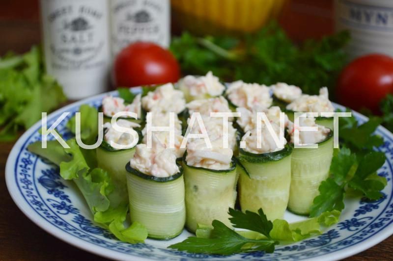 рулетиков из огурцов с сыром и крабовыми палочками.