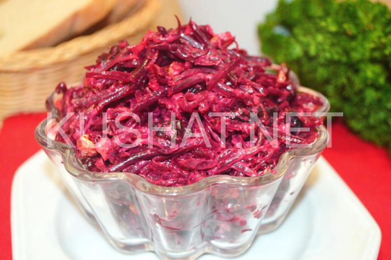 Салат из свеклы с черносливом и грецкими орехами. Фото
