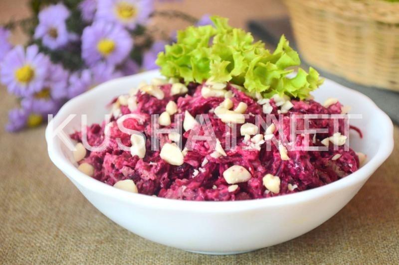 Салат из свеклы с печенью готов. Переложите его на тарелку, в которой будете подавать. Посыпьте рубленым арахисом или грецкими орехами. Приятного вам аппетита. Также вы можете приготовить и салат с печенью, морковью и яйцами.