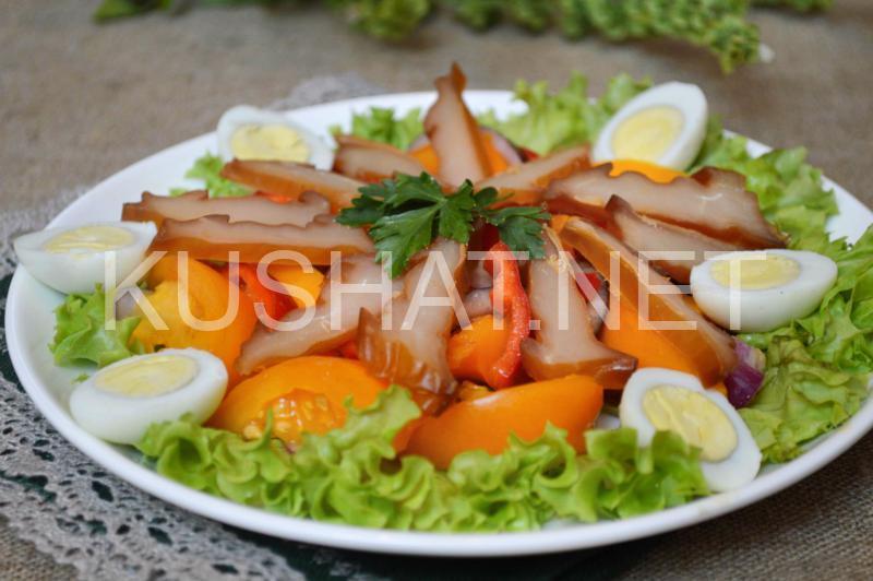 Салат с копченым кальмаром, помидорами и перепелиными яйцами