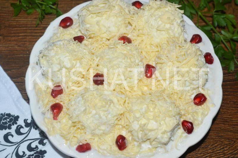 Салат посыпьте тертым сыром, натертым на средней терке. Украсьте салат зернами граната. Вот и все, новогодний салат «Сугробы» с курицей и грибами готов. Приятного вам аппетита. Буду рада, если этот рецепт салата вам понравился и пригодится.