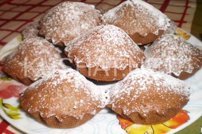 Формочки с шоколадными кексами поставьте на противень. Отправьте в духовку, температура которой составляет 185-190С. Выпекайте на протяжении 30-35 минут на средней полке духовки. Готовые шоколадные кексы с изюмом после того как они слегка остынут, извлеките из формочек, перевернув их на плоскую тарелку. Присыпьте сахарной пудрой.
