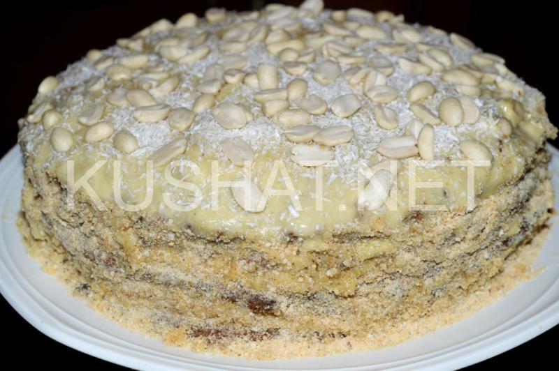 Для пропитки коржей я использую воду с медом или сахаром. Промажьте кремом коржи, потом бока торта. Бока присыпьте крошкой.