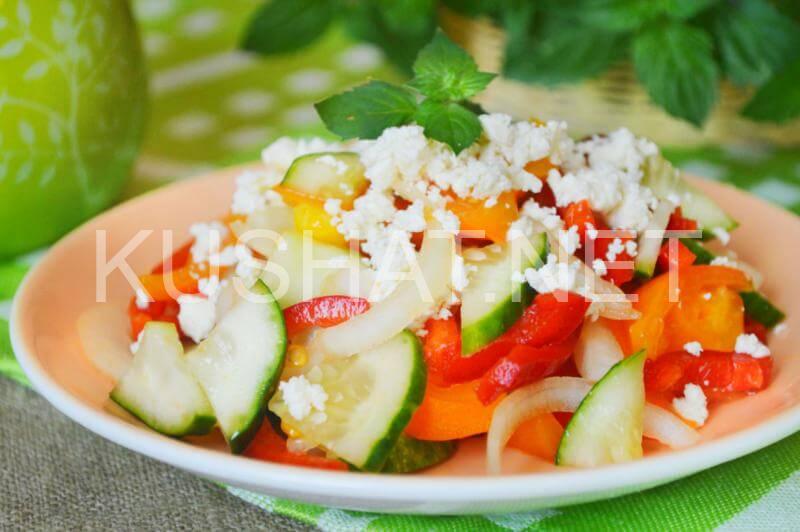 Выложите заправленные овощи на тарелку. Брынзу натрите на мелкой терке или же раскрошите руками, как для салата из свеклы с рукколой и брынзой. Болгарский шопский салат готов.