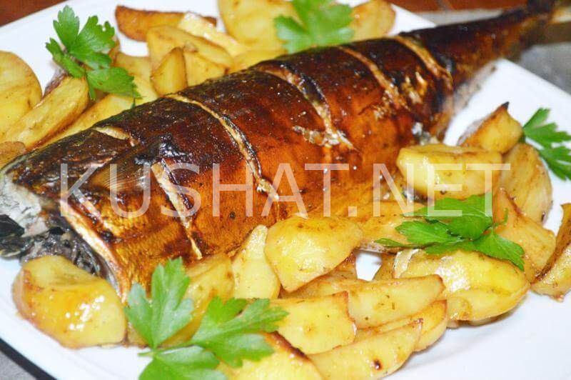 Поставьте в духовку температурой 180С. Скумбрию с картошкой запекайте не мене 30 минут. Готовая скумбрия, запеченная в соевом соусе в духовке должна покрыться хрустящей корочкой. Основной гарнир и рыбное блюдо готово, осталось приготовить салат. Приятного вам аппетита. Буду рада, если этот рецепт запеченной скумбрии в соевом соусе вам пригодится. Попробуйте приготовить также и скумбрию с овощами в духовке.