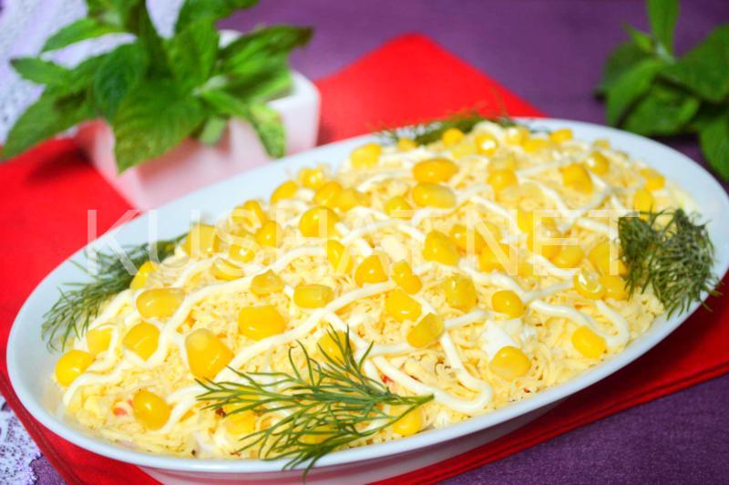Слоеный салат с тунцом, крабовыми палочками и кукурузой