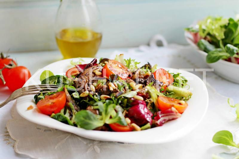 Теплый салат с куриной печенью, помидорами и грибами. Рецепт с фото