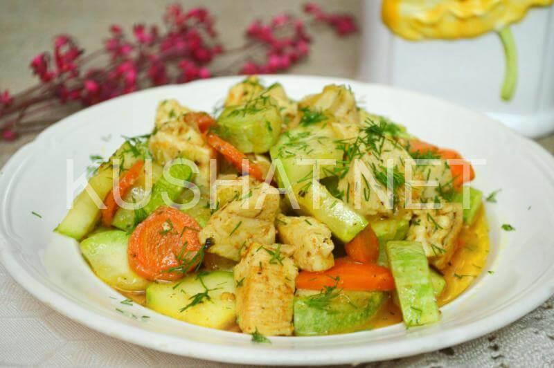 Тушеные кабачки с курицей. Фото